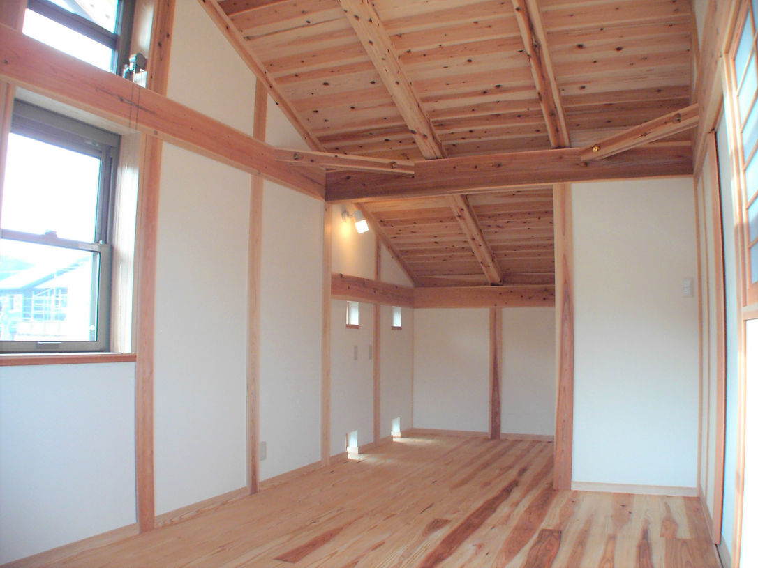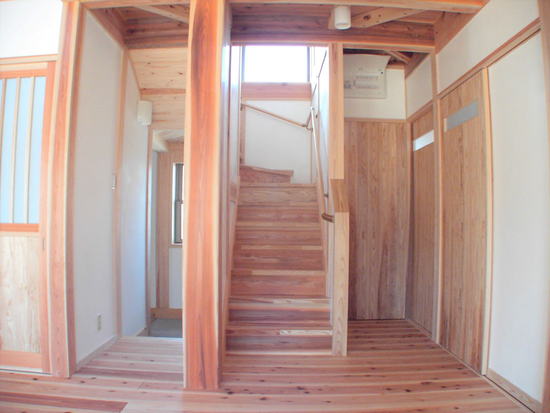 内部は吹抜けのあるリビングを中心に1階と2階が繋がり、引戸の特徴を生かした広がりのある平面計画も相まって、家族の気配を近くに感じつつ、生活の変化に柔軟に対応できる可変性のあるプランです。構造体や内部仕上には地元の智頭杉を活用し、室内に表して使うことで素朴さや柔らかさ、力強さを表現しつつ、仕上を省略して建築費のコストダウンを図っています。